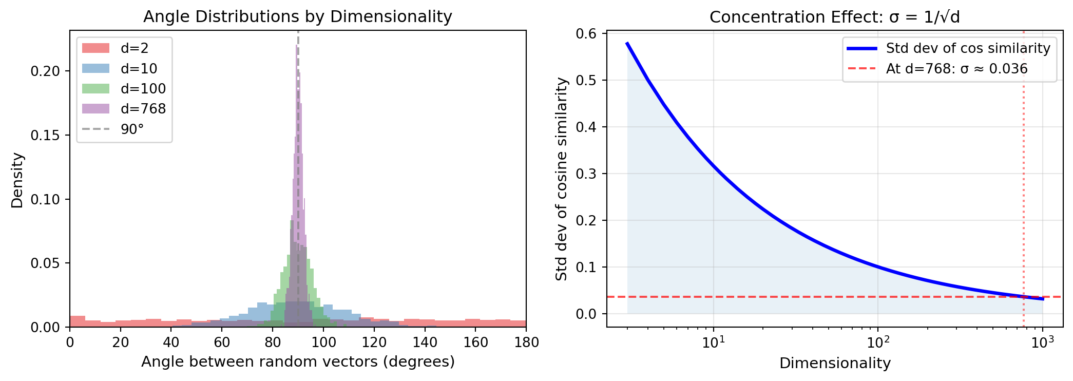 │ Random vectors are ~90° apart (nearly orthogonal) │