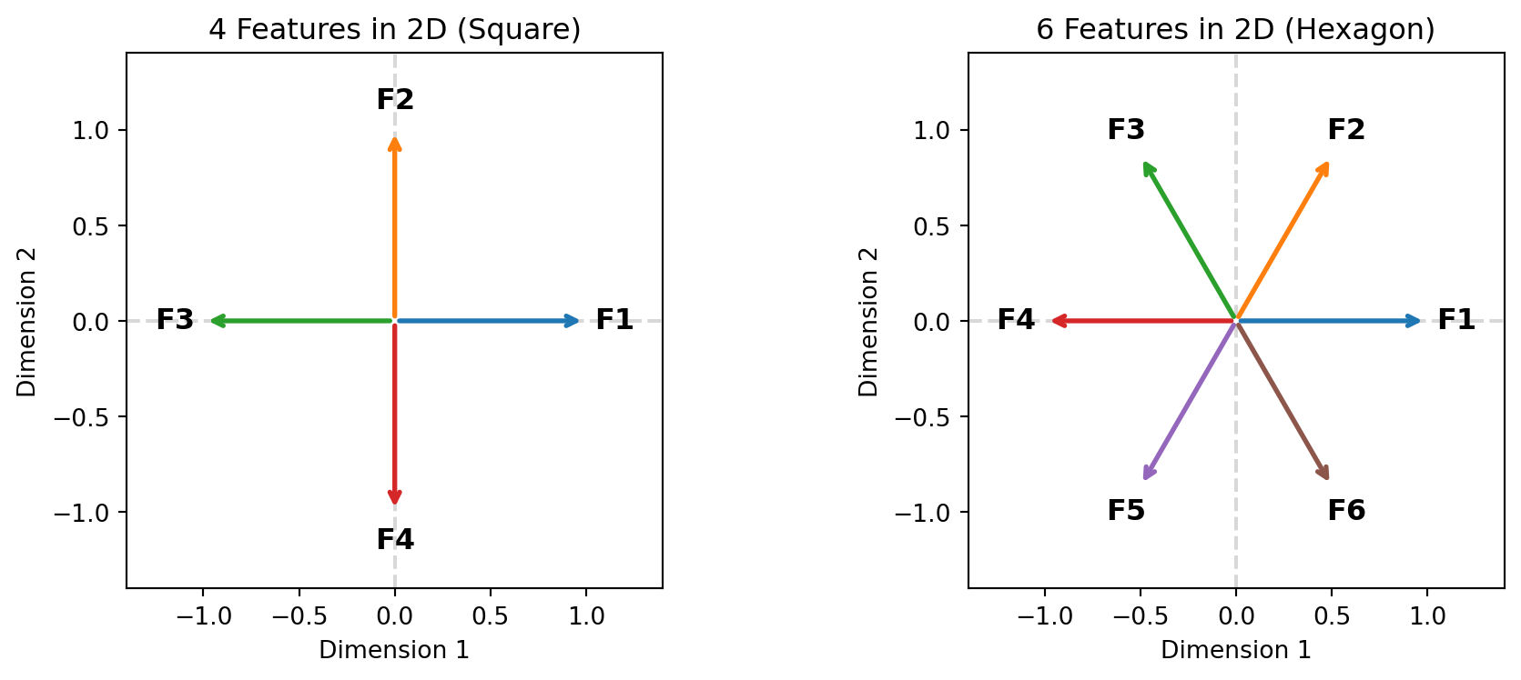 #| fig-cap: "Optimal arrangements for features in 2D: 4 features form a square (left), 6 features form a hexagon (right). Each feature is a direction (arrow) from the origin."