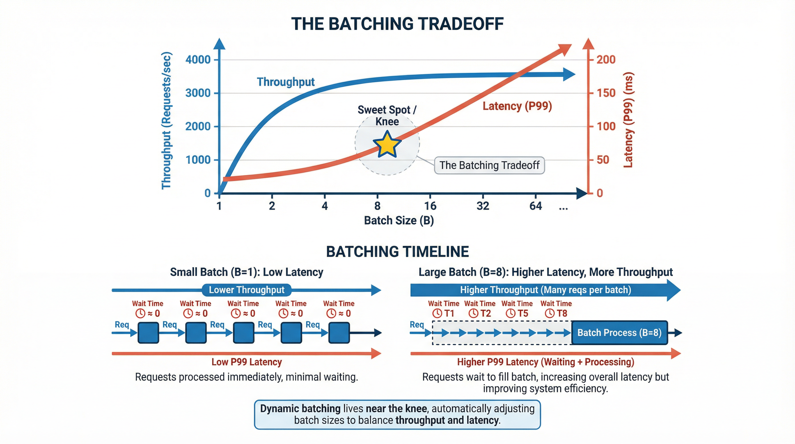 Dynamic batching tries to live near the knee: enough batch size to raise \(\mu\), but not so much delay that P99 explodes.