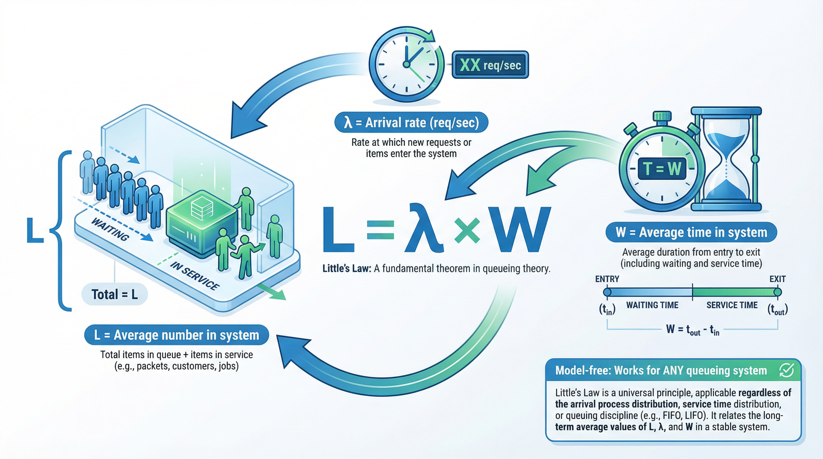Little’s Law is model-free. It doesn’t care about distributions or scheduling. If you can measure two of the three, the third is fixed.